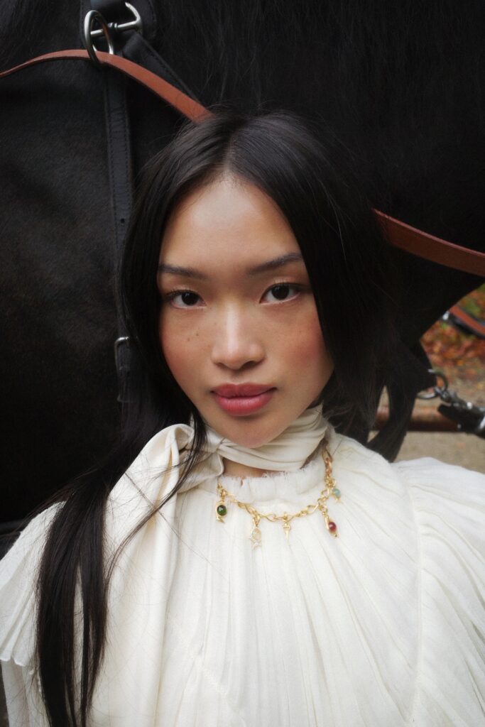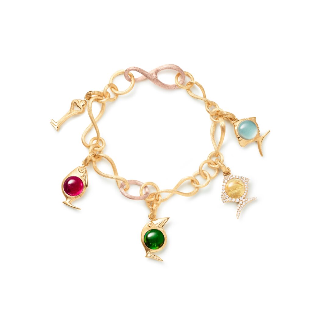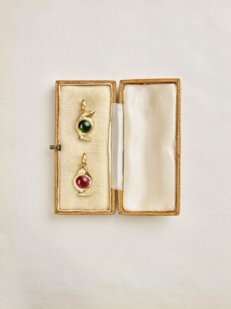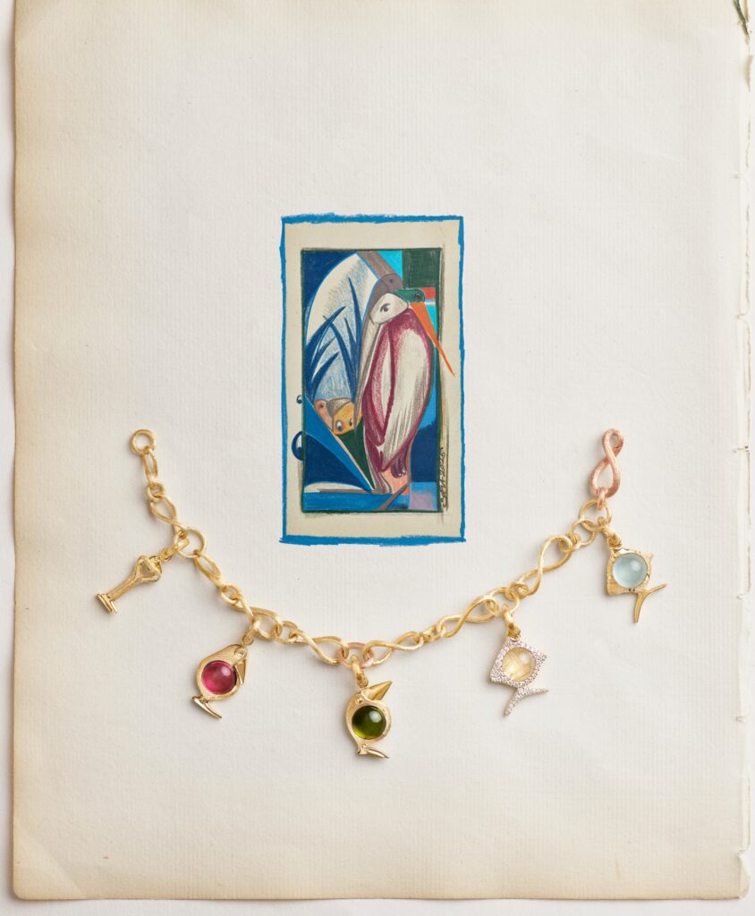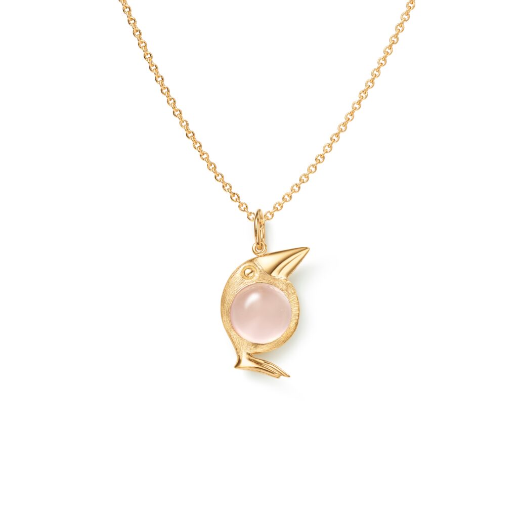 Die Kollektion besteht aus vier Vogel-Charms sowie einem Vogelschluessel-Charm. Gefertigt aus 18 Karat Gold, kombiniert mit sorgfältig ausgewählten Edelsteinen wie cerisefarbenem Turmalin, grünem Turmalin, Rutilquarz oder Rosenquarz. Jeder Stein steht für eine eigene Stimmung und Charaktertiefe, ohne sich in Symbolik zu verlieren.