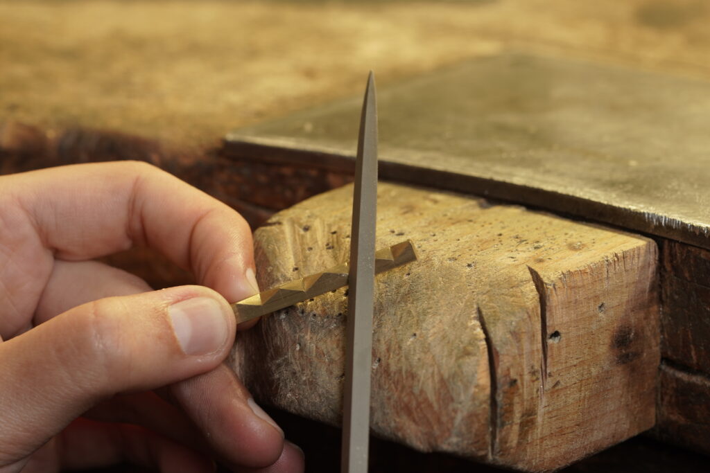In den vergangenen drei Monaten hat Lisa bereits bemerkenswerte Fortschritte gemacht. Besonders intensiv widmete sie sich einer grundlegenden, aber entscheidenden Kunst des Goldschmiedehandwerks: dem Feilen. Was fürs Auge simpel wirkt, ist in Wahrheit eine hochpräzise Technik. Beim Feilen von Silber übt sie derzeit an einem Blütenanhänger, der aus mehreren fliessenden Formen besteht. Ziel ist es, Material so abzutragen, dass die gewünschte Kontur nicht nur entsteht, sondern harmonisch ineinander übergeht. Gerade diese Übergänge testen das Gefühl für Symmetrie, Linienführung und den sorgsamen Umgang mit Kraft – zu viel Druck, und die Form verliert ihre Eleganz.
