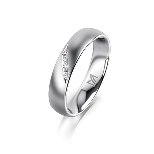 Der Trauring von Mirsela zeigt sich in mattierter Oberfläche mit ellipsenförmigem Profil (4 mm breit) und vier Brillanten im Gesamtgewicht von 0.20ct (G-VS), diagonal in feiner Kornfassung eingesetzt. Ein Ring, der Modernität mit Zurückhaltung verbindet.