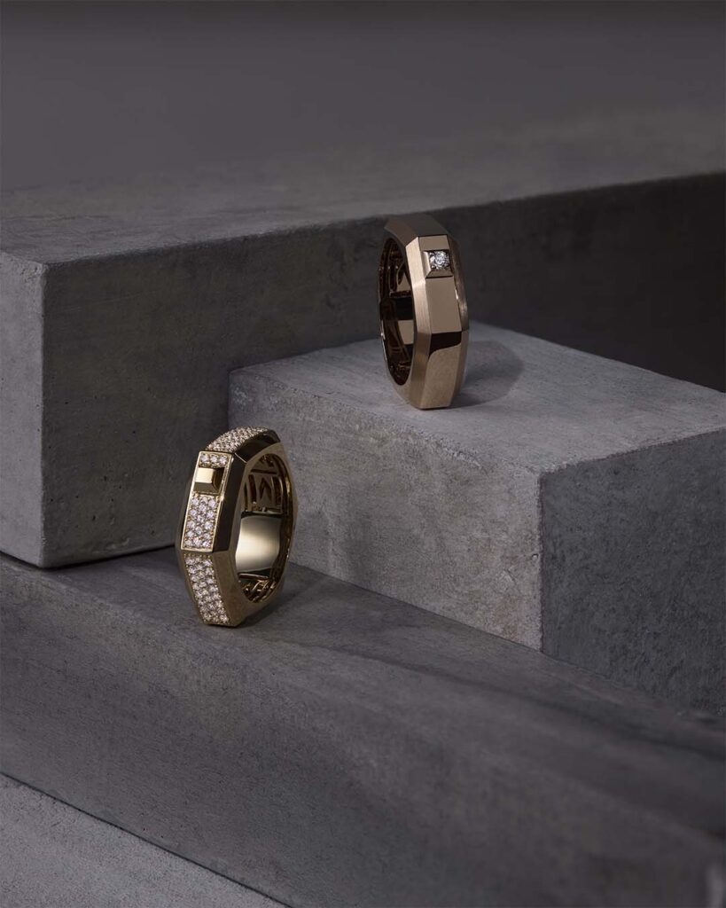 Kreisformen wirken weich und harmonisch, während kantige Linien Kraft und Struktur vermitteln. Beide Elemente verschmelzen zu einer Schmuckarchitektur, die bewusst jenseits klassischer Geschlechtercodes gedacht ist.