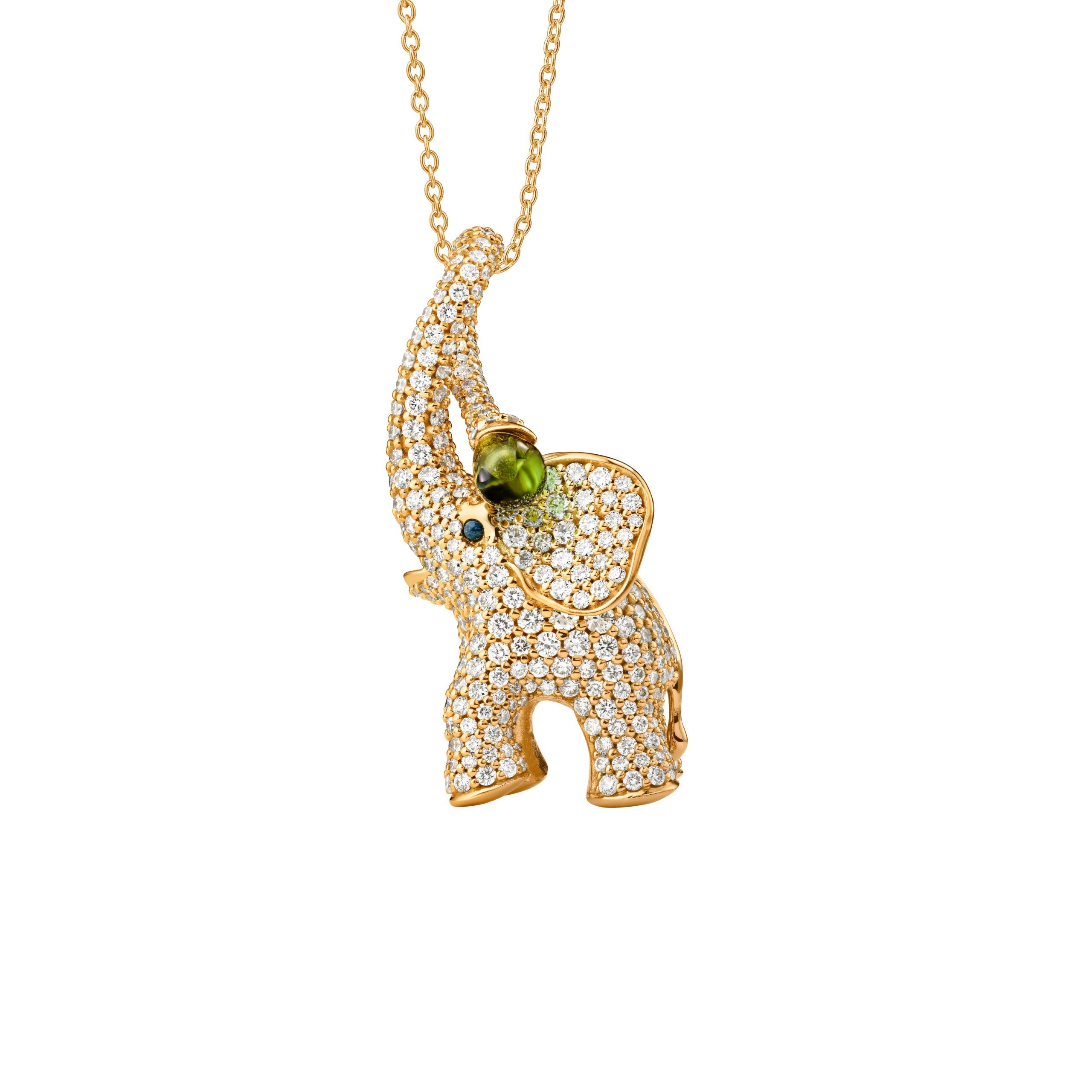 | Elefanten haben Ole Lynggaard von jeher fasziniert. Das grösste auf dem Land lebende Säugetier ist für ihn das ultimative Symbol von Weisheit, Treue, Stärke und Glück. Durch die Jahre tauchen die grauen Riesen immer wieder in seinen Kollektionen auf. Die Pavée gefasste Spitze seines Rüssels, ist so naturalistisch gestaltet, dass es fast wirkt, als würde er gleich Wasser in die Menge prusten. |