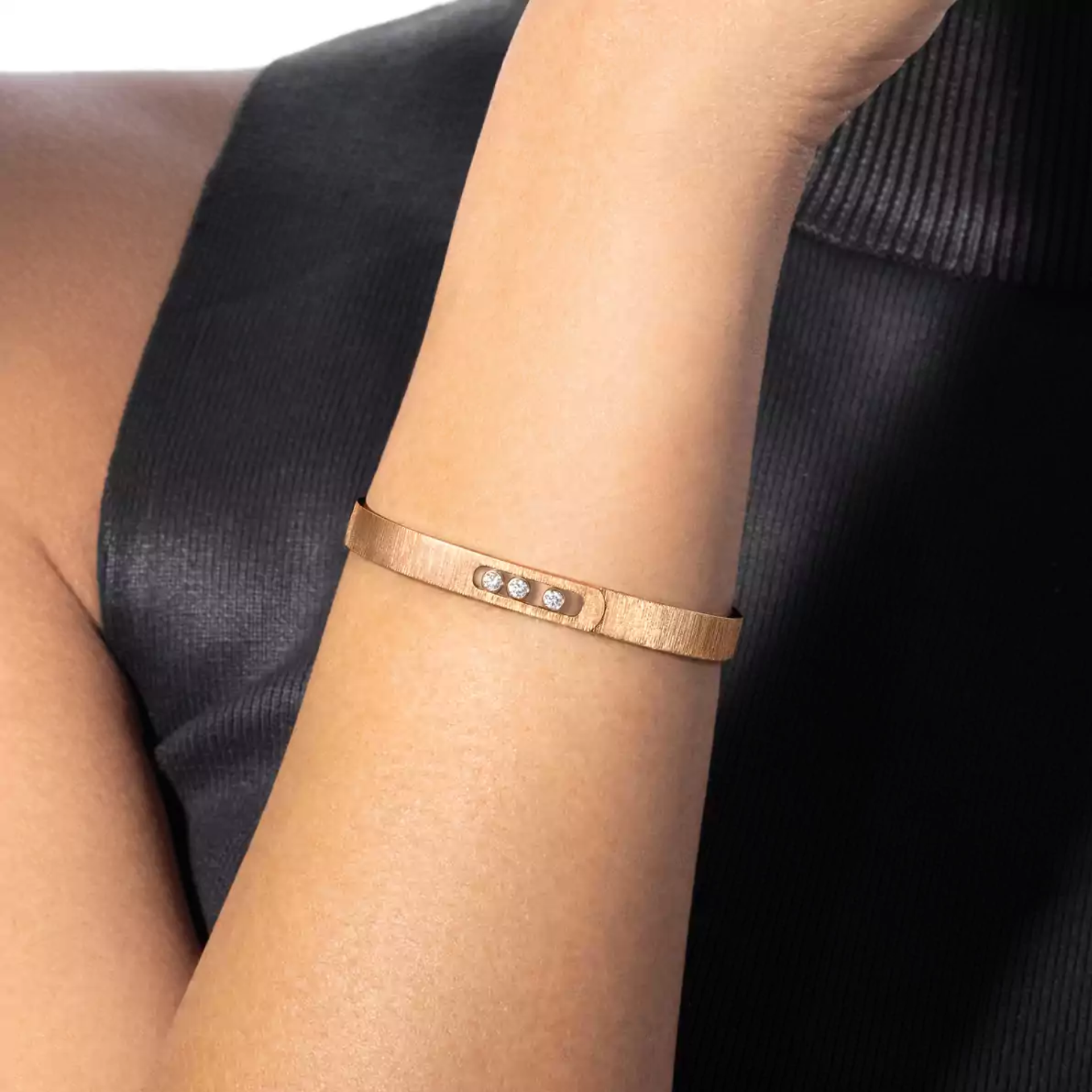 Der Move Noa Armreif, ein unverwechselbares Schmuckstück von Messika, erfindet sich in einem neuartigen Dialog zwischen ziseliertem Roségold und Diamanten neu. Durch die präzise Handarbeit fängt jede Ziselierung das Licht ein und reflektiert es für einen intensiven Effekt. Das Roségold zeigt sich hier in einem subtilen Vintage-Akzent. Das Spiel mit Materie und Relief in Verbindung mit dem Rhythmus der beweglichen Diamanten hüllt das Handgelenk in einen ausdrucksstarken und selbstbewussten Stil, ohne jemals zu übertreiben. Ein unverwechselbares Diamantarmband für Damen und Herren, das allein oder in Kombination mit anderen Messika Armreifen aus Gold und Diamanten getragen werden kann.