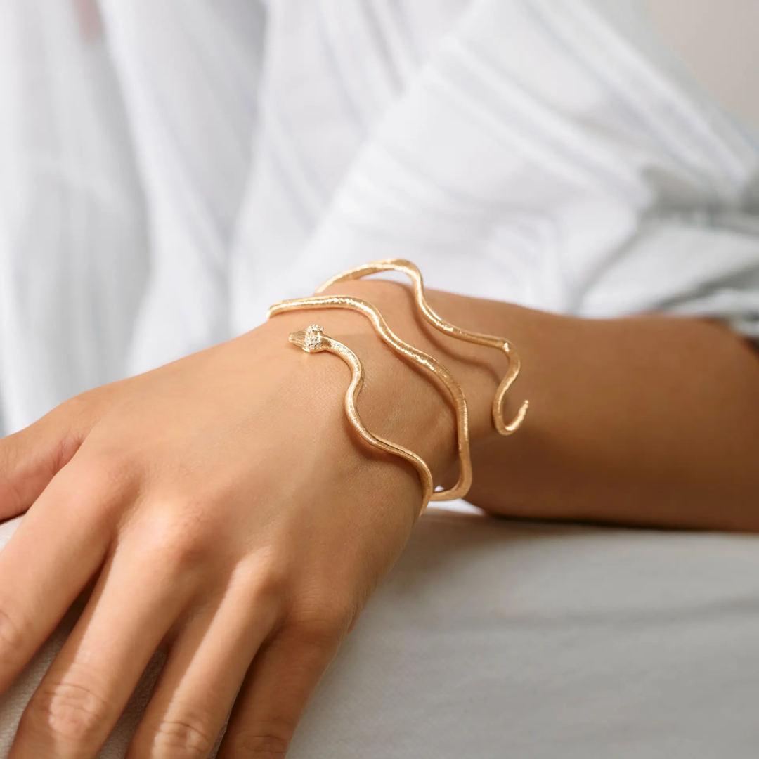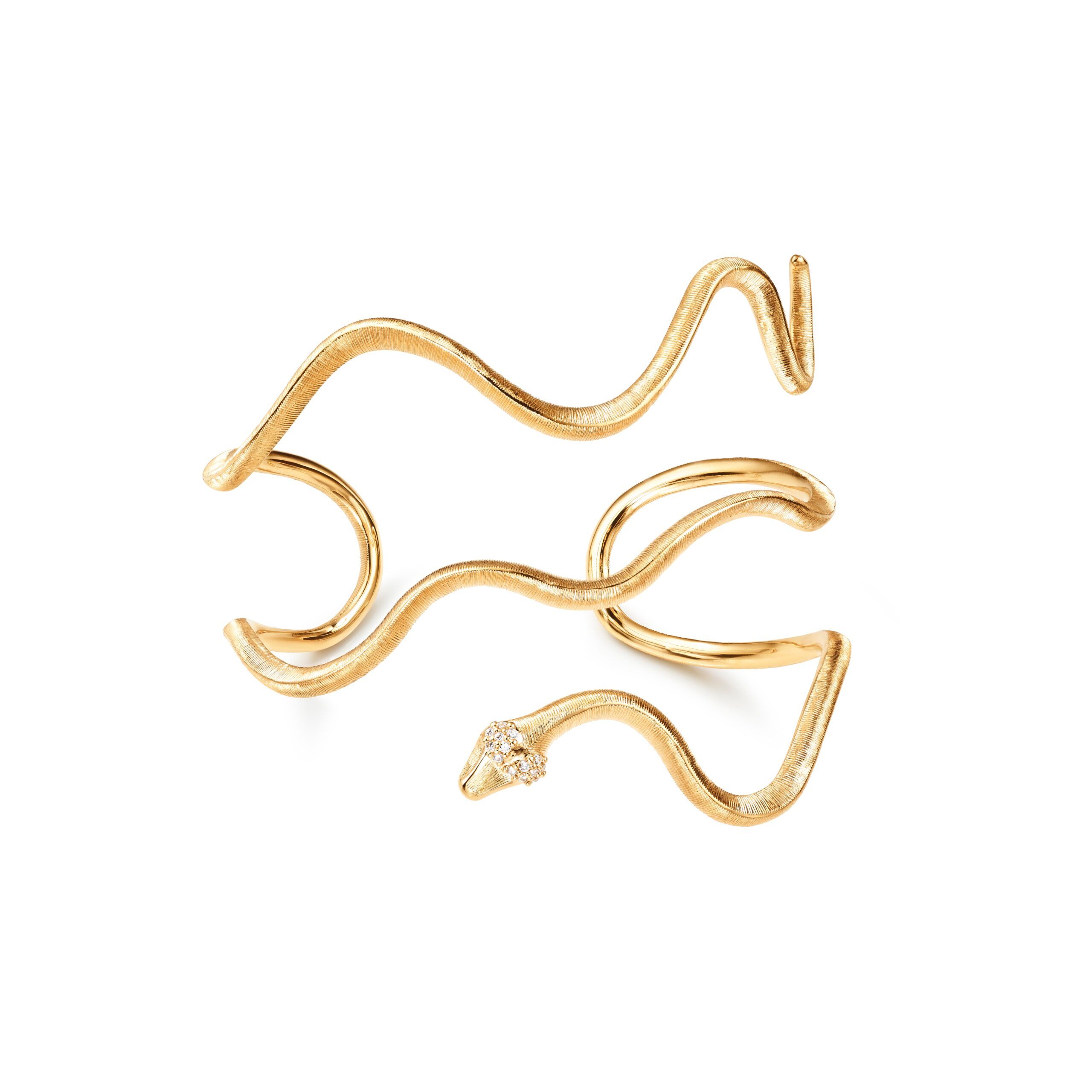 Dieser Snakes-Armreif ist aus 750/- Gelbgold gefertigt und mit 14 Diamanten von insgesamt 0.08 Karat tw/vs besetzt. Das Design besticht durch seine skulpturale Silhouette und seine spielerisch geschwungenen, weichen Kurven. Die Goldoberfläche wird sorgfältig von Hand satiniert. Dadurch entsteht ein einzigartiges Finish, das von herausragender Handwerkskunst zeugt. Die Innenseite des Armreifs hat eine poliertes Finish. Die Snakes-Kollektion wurde von Ole Lynggaard ins Leben gerufen. Dieses Stück wurde von Charlotte Lynggaard entworfen. Teil der Snakes-Kollektion.