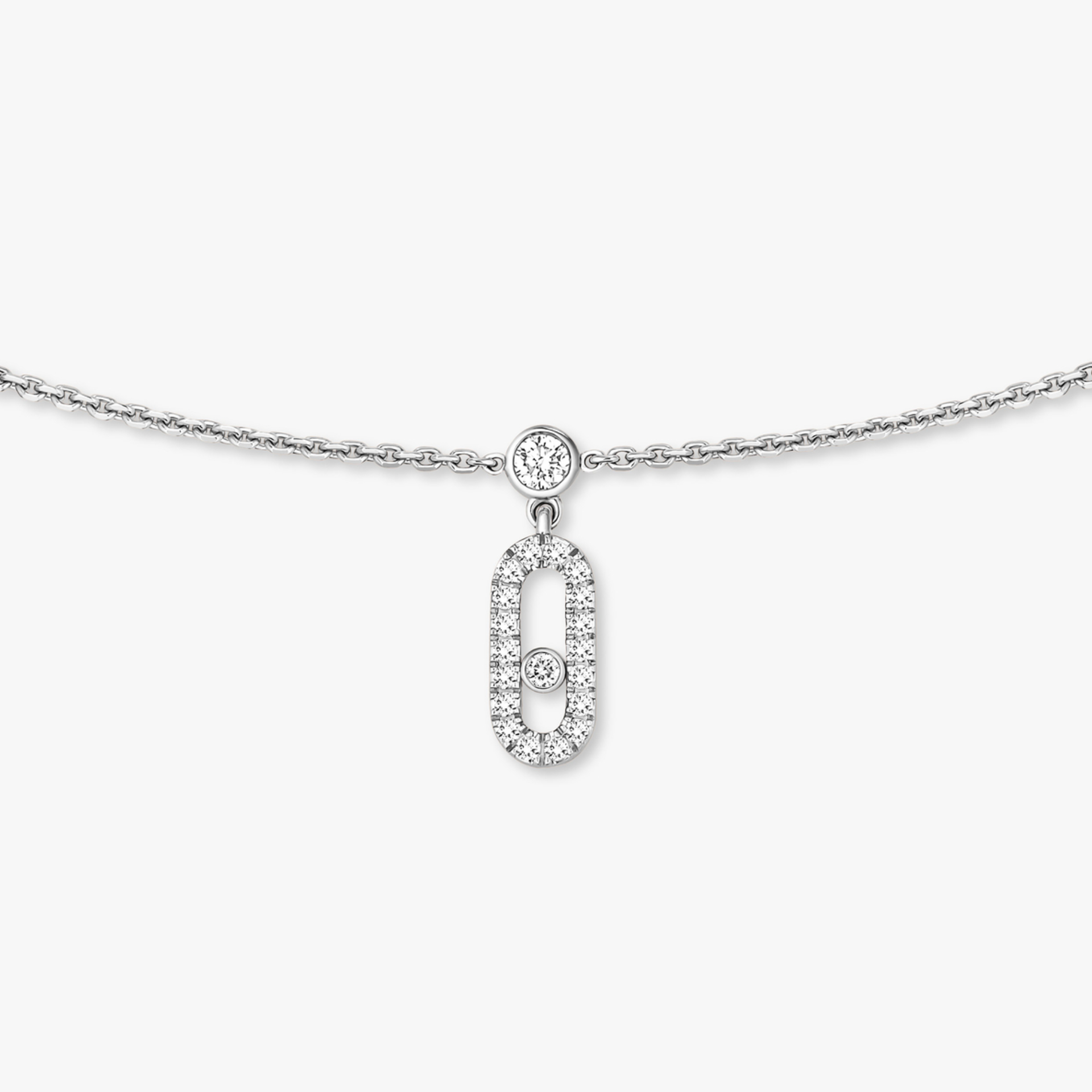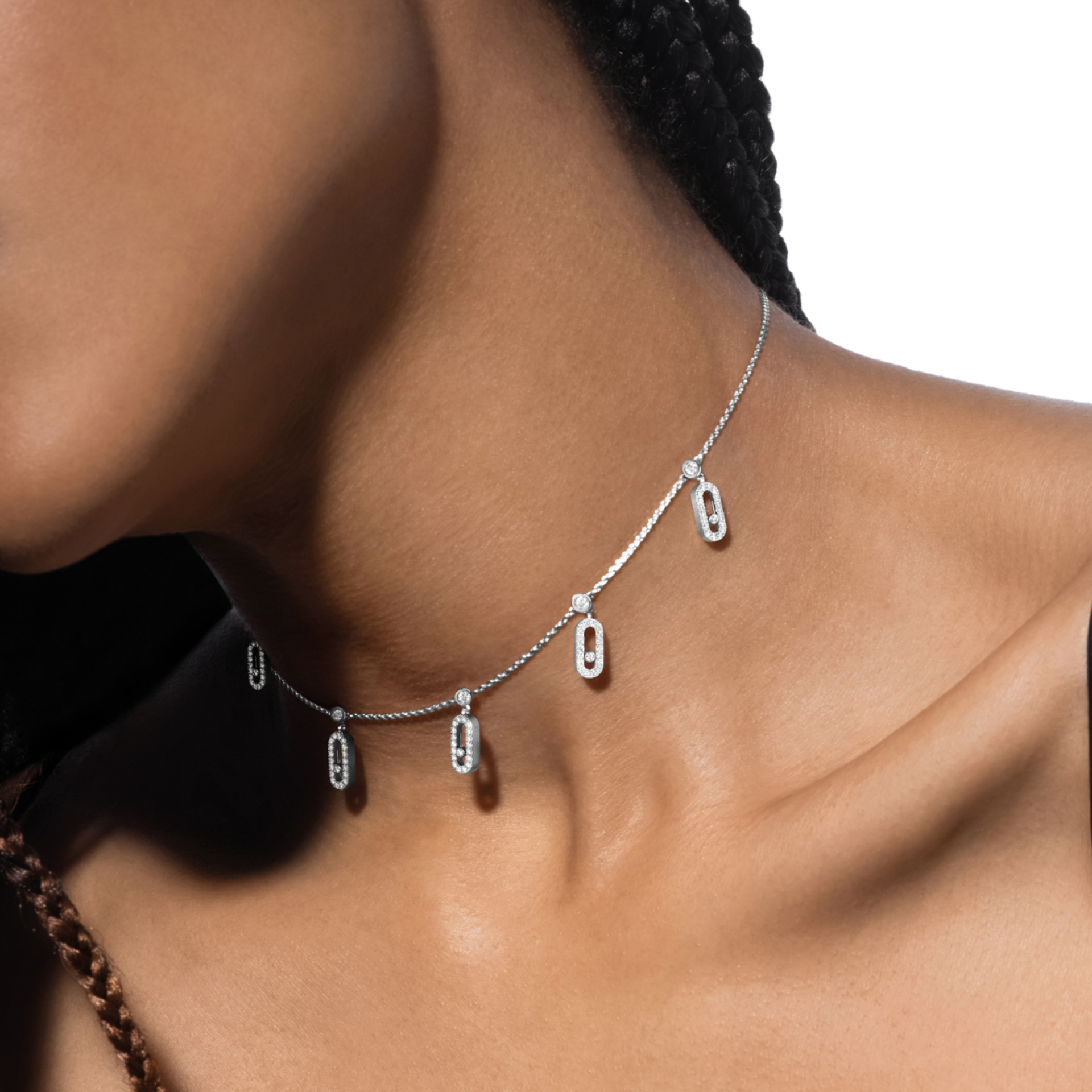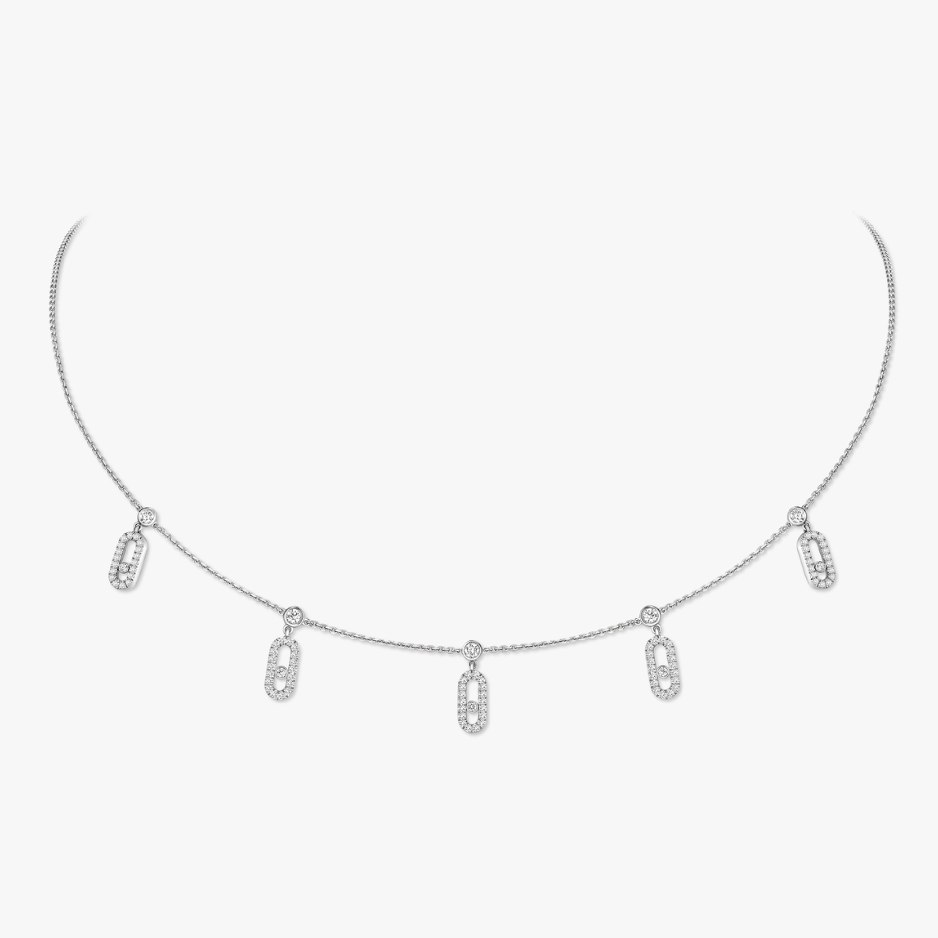 Lassen Sie sich von der Move Uno Halskette mit Quasten aus Weissgold und Diamanten verführen! Sie ist aus 18 Karat Weissgold gefertigt und besteht aus einer feinen Kette, an der 5 Move Uno-Charms aus schillernden Diamanten hängen. Als Ode an die funkelnden Lichterspiele der Diamanten besticht sie durch ihre sanfte Geschmeidigkeit und Bewegung, die sie charakterisieren. Dank ihres Designs mit einem Karabinerverschluss mit Schiebesystem können Sie die Kette als Choker oder Halskette tragen.
