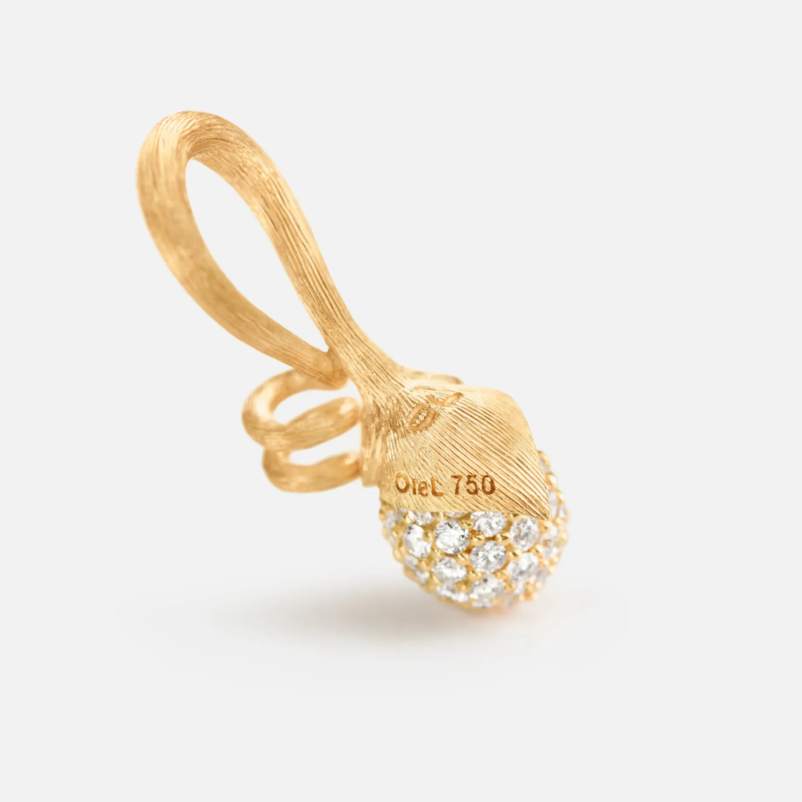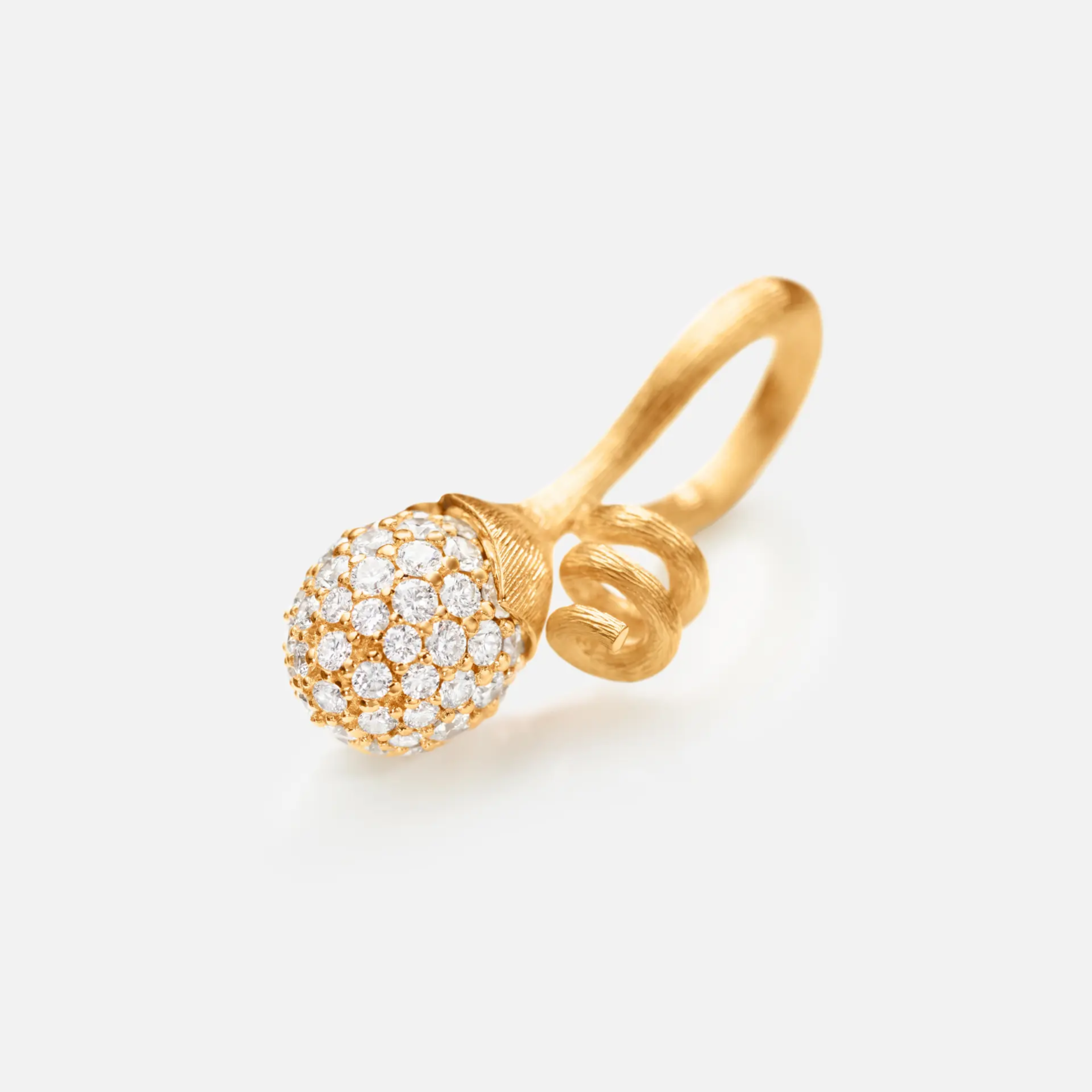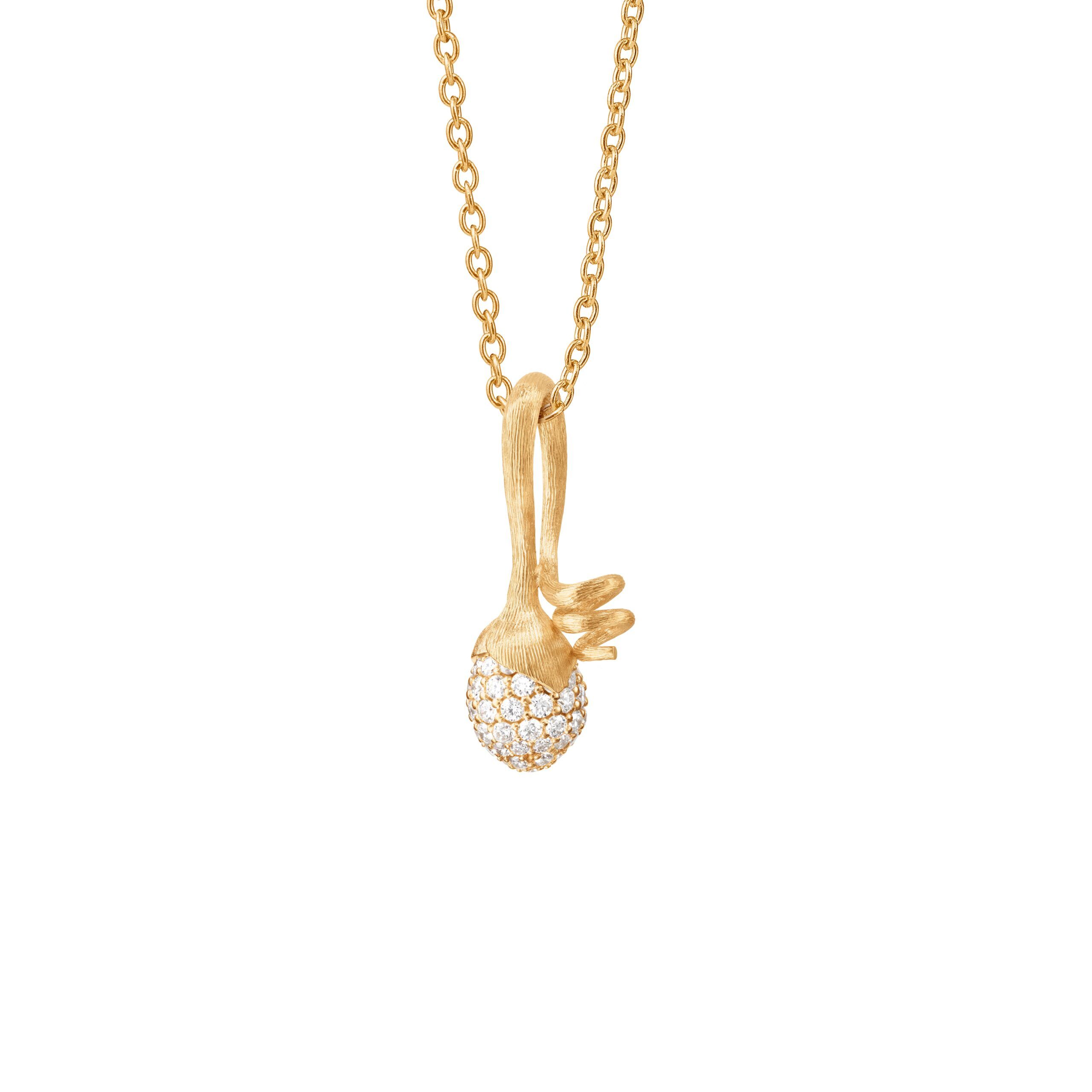 Entworfen von Charlotte Lynggaard. Der Lotus Sprout Anhänger wurde aus 750/- von Hand satiniertem Gelbgold hergestellt, mit einer Knospe, die 62 Diamanten in Pavé-Fassung von insgesamt 0,53 carat TWvs enthält. Teil der Lotus Collection.