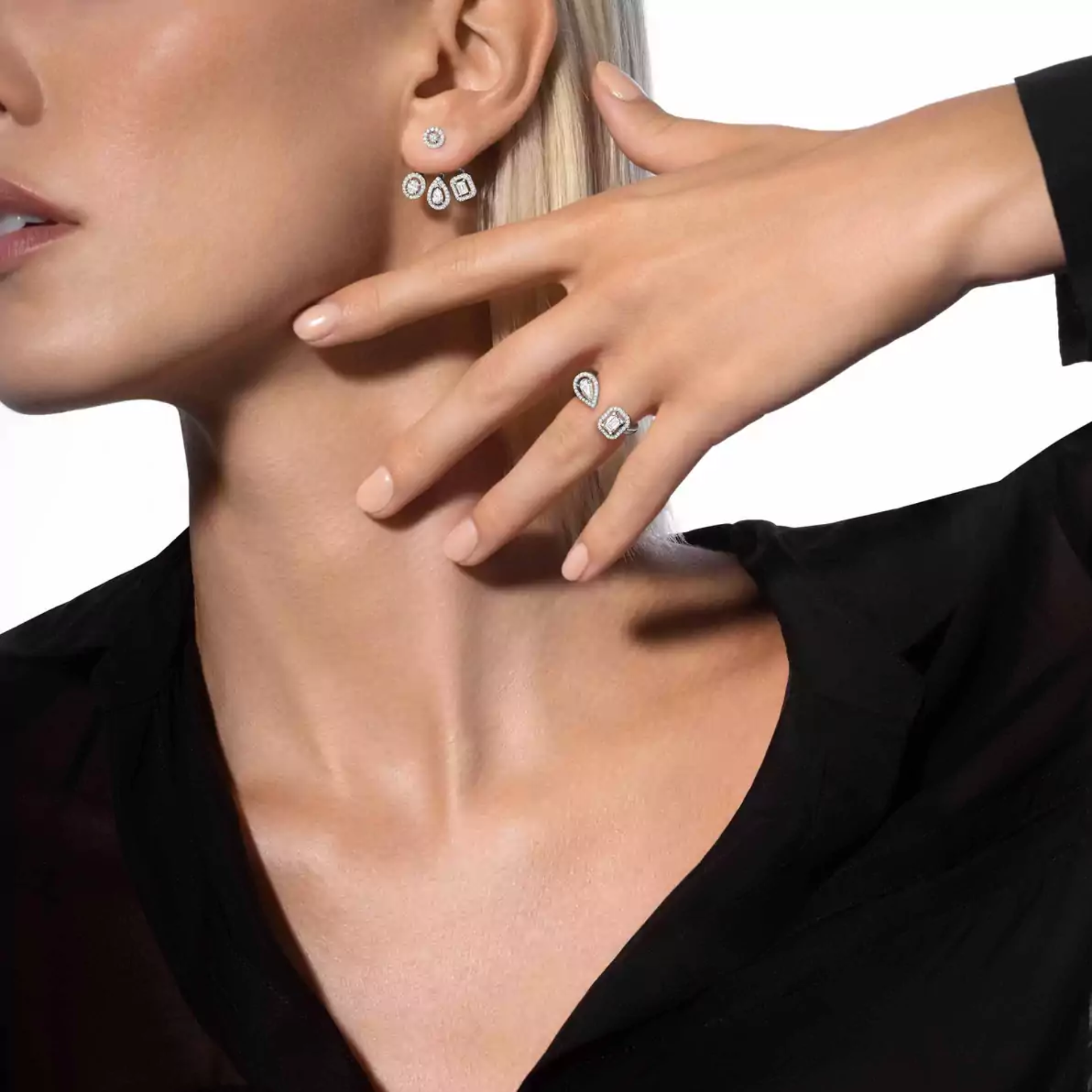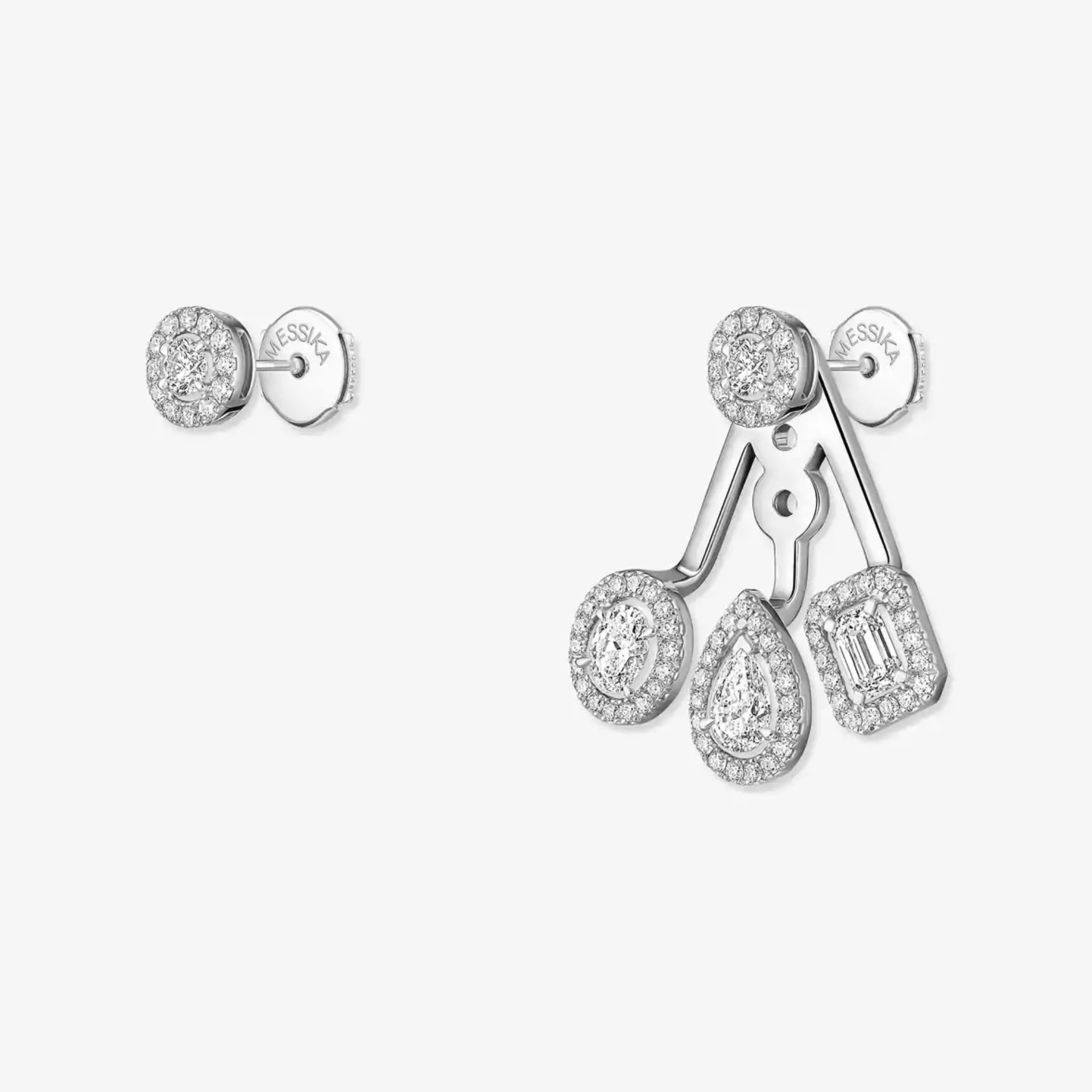 Im Einklang mit den aktuell angesagten Schmuckstücken bieten diese mit Diamanten ausgefassten My Twin Trio Ohrringe aus Weissgold einen Zwei-in-eins-Schmuck. Die einfach zu tragenden, schicken Diamant-Ohrstecker eignen sich perfekt, um die Frau im Alltag in voller Schönheit erstrahlen zu lassen. Setzen Sie für ein noch kühneres Statement auf Asymmetrie und tragen Sie den Teil unter dem Ohrläppchen an dem Ohr Ihrer Wahl. Eine Schmuckkreation, die auf die unerwartete Kombination von vier Diamantschliffen setzt: Brillantschliff, Tropfenschliff, Smaragdschliff und Ovalschliff. Jedes Motiv wird von schillernden Diamanten in Mikro-Fassung umgeben und dank des Lichterspiels der Diamanten auf 18 Karat Weissgold hervorgehoben. Die mit Diamanten ausgefassten Ohrringe aus Weissgold erleuchten das Gesicht und verleihen den Augen eine besondere Ausstrahlung. Der Teil unter dem Ohrläppchen passt sich dank dreier Löcher an Ihr Ohr an, mit deren Hilfe der Platz zwischen den zwei Motiven variiert werden kann.