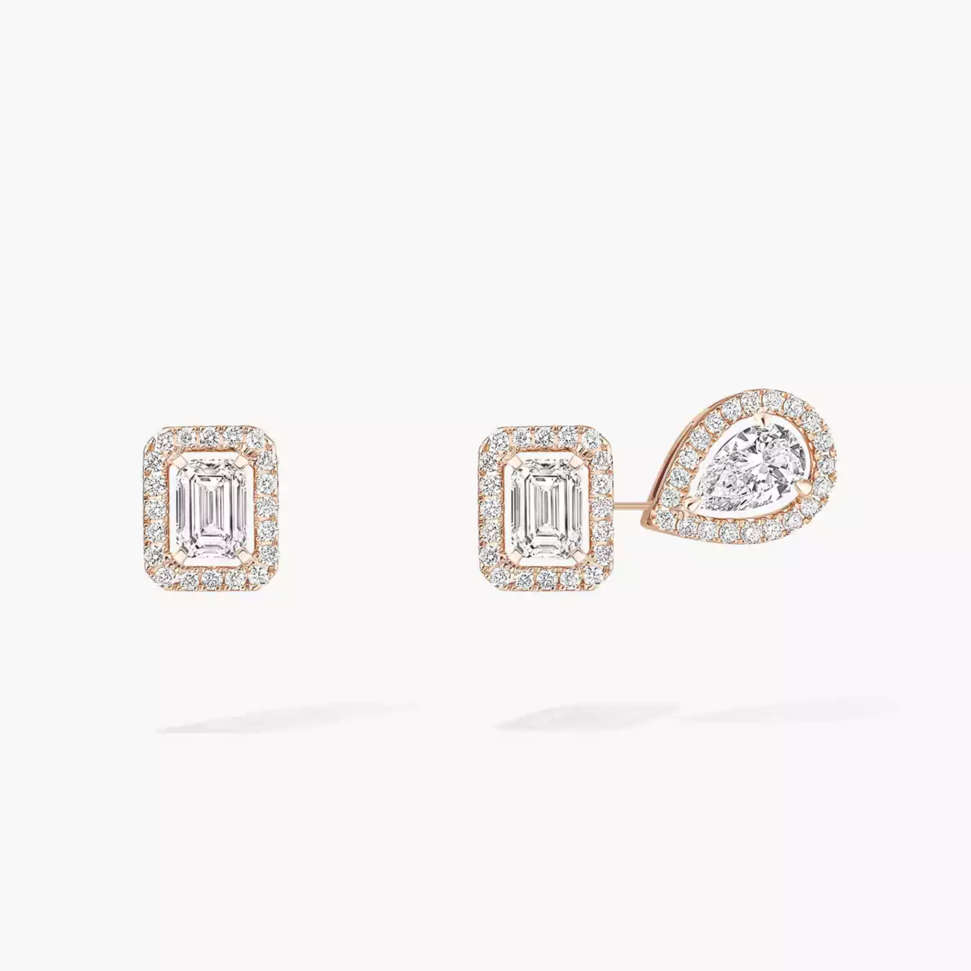 Das Leitmotiv der Luxusschmuck-Kollektion My Twin lautet Kühnheit, Kreativität und Modernität. Valérie Messika interpretierte den Klassiker Damenohrringe in einer trendigen, asymmetrisch zu tragenden Form. Diese Diamantohrringe aus Roségold können als Paar oder einzeln getragen werden. Rechts ein Ohrstecker mit einem Diamanten im Smaragdschliff von 0,20 Karat. Links ein aus zwei Diamanten von je 0,20 Karat bestehender Ohrring: Einer ebenfalls im Smaragdschliff und der zweite im Tropfenschliff. Sie sind unsichtbar miteinander verbunden, so dass der Eindruck eines doppelten Ohr-Piercings entsteht. Ein zauberhafter, typischer Messika Effekt!