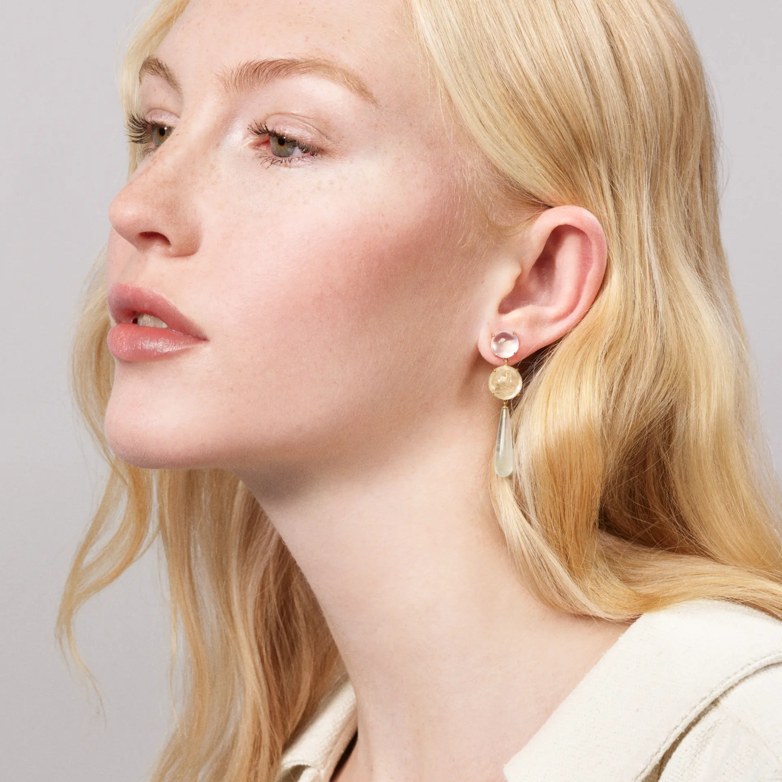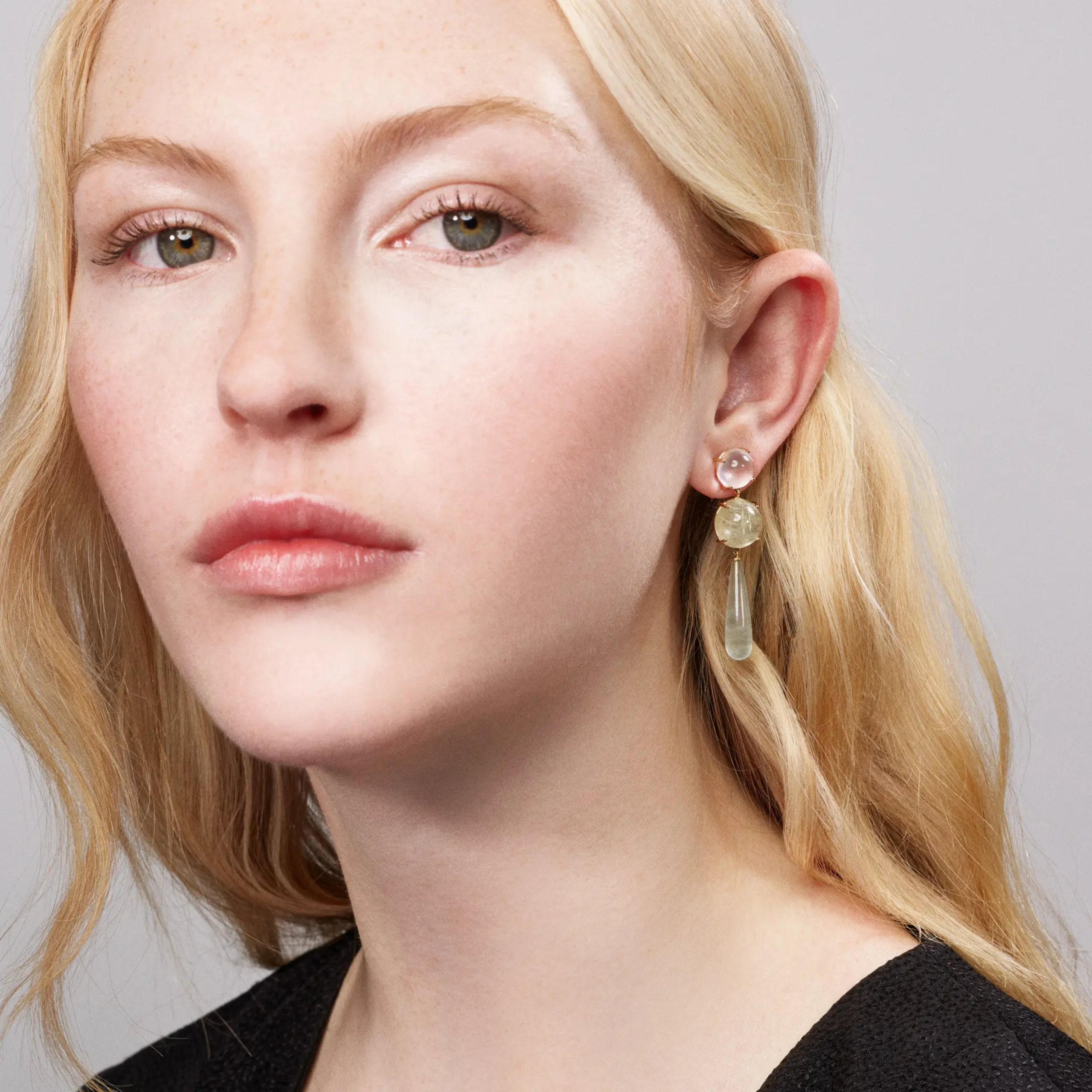 Diese von Charlotte Lynggaard entworfenen Lotus-Ohrstecker sind aus 18-karätigem Gelbgold mit polierter Oberfläche gefertigt und mit einem Rosenquarz (9 mm), einem Rutilquarz (11 mm) sowie blaugrünen Aquamarintropfen (22 x 6 mm) besetzt. Wird als Paar verkauft. Teil der Lotus-Kollektion.
