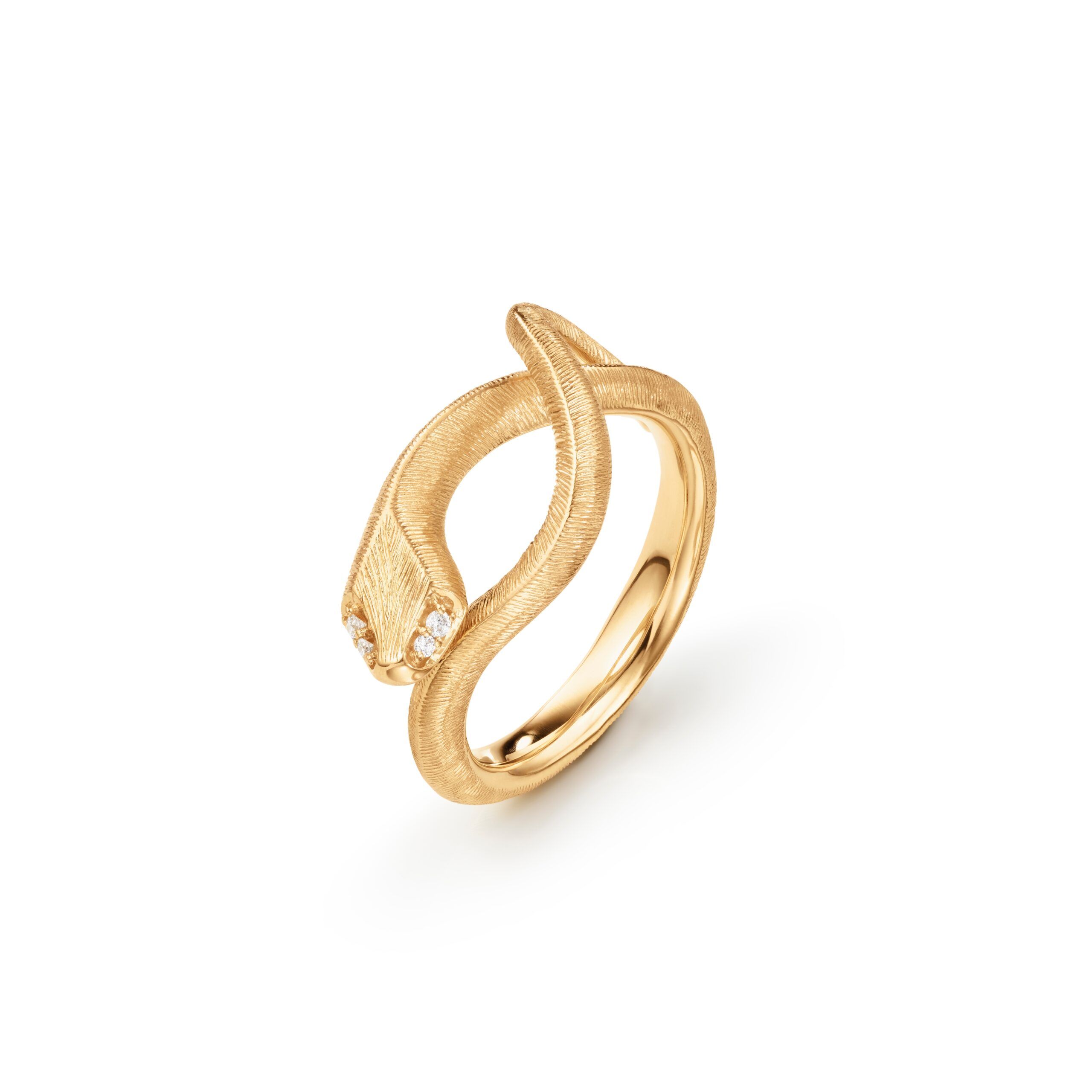 Entworfen von Ole Lynggaard. Der Snakes Ring klein ist handgefertigt aus 750/- Gelbgold und mit 4 Diamanten von insgesamt 0.02ct TWvs besetzt. Von Goldschmiedemeistern in Handarbeit gefertigt, sind die sichtbaren Goldflächen von Hand satiniert, während die Innenseite des Rings poliert ist. Teil der Snakes Kollektion.